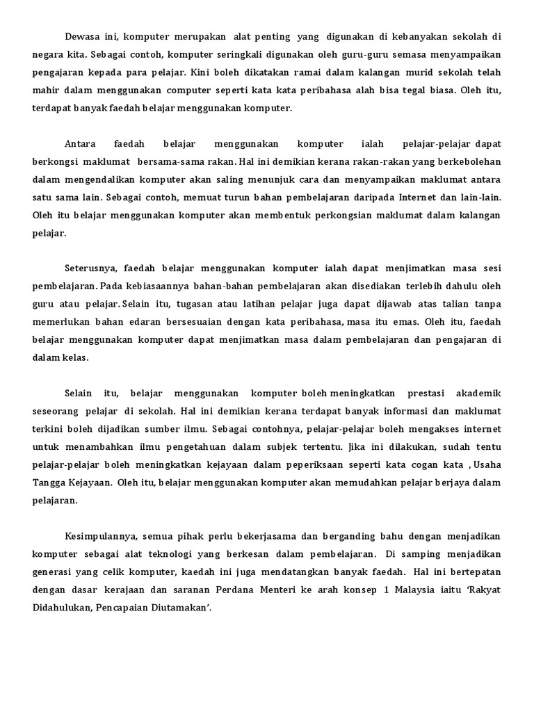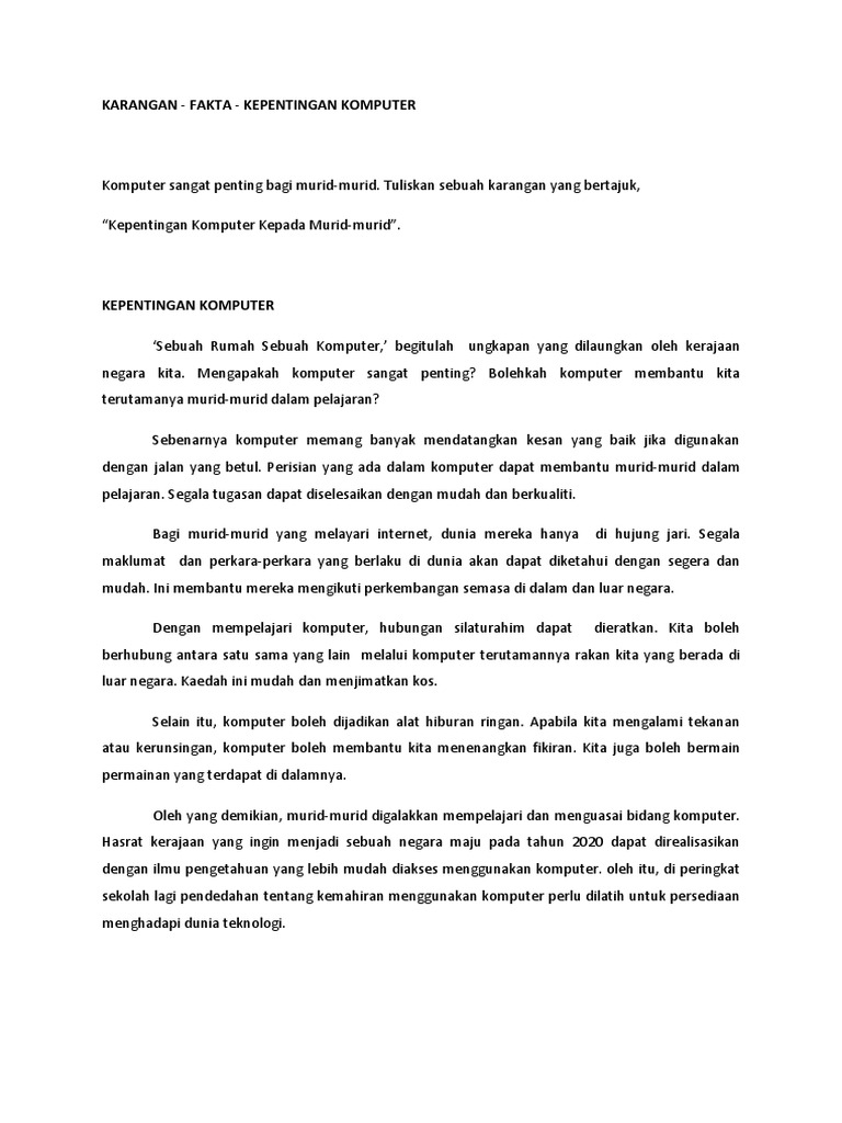 Anda telah menyertai pertandingan perbahasan yang diadakan di sekolah anda. Malangnya, pelajar tidak mengambil kesempatan untuk menggunakan kemudahan yang ada untuk tujuan penguasaan terhadap kemahiran berkenaan. Kebaikan komputer (karangan pt3) pada masa ini ramai orang menggunakan komputer dalam kehidupan seharian. Internet merupakan teknologi asas dalam pembangunan teknologi maklumat. Zaman beralih musim berubah, fasa demi fasa perubahan dunia telah berlaku. Komputer sangat penting dalam kehidupan kita pada masa kini. Kebaikan menggunakan komputer dalam pengajaran dan pembelajaran. Hasil kerja dengan menggunakan komputer juga tentulah lebih kemas, bersih dan cantik. Contoh karangan jenis fakta 1 cute766. Terdapat banyak kepentingan komputer kepada murid. Tanpa penggunaan komputer, urusan yang sepatutnya menjadi mudah hanya akan menjadi lebih sukar. Segala urusan harian memerlukan penggunaan komputer seperti menyiapkan kertas kerja, menulis karangan dan sebagainya. Walau bagaimanpun kita mesti mengawal diri daripada terlalu leka menggunakan komputer kerana ia juga boleh mendatangkan masalah seperti tidak fokus kepada pelajaran dan sebagainya.